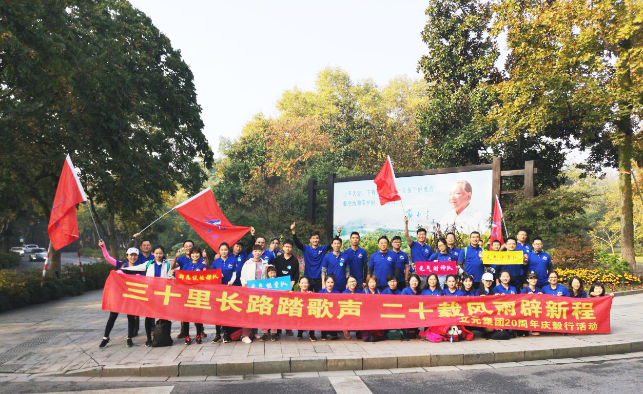 立冬前后淫雨霏霏的日子,終于在這個周六,暖陽乍現,晴空如洗。11月10日,一抹立元藍點亮了西湖的青山綠水。為慶祝集團成立20周年,五十余名活力滿滿的立元人,身著20周年文化衫,擎著立元大旗,開啟了總計15公里的毅行活動。